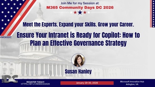 January 30, 2026. M365 Community Days DC 2026. Arlington, VA. (in person). Ensure Your Intranet is Ready for Copilot: How to plan an effective governance strategy.